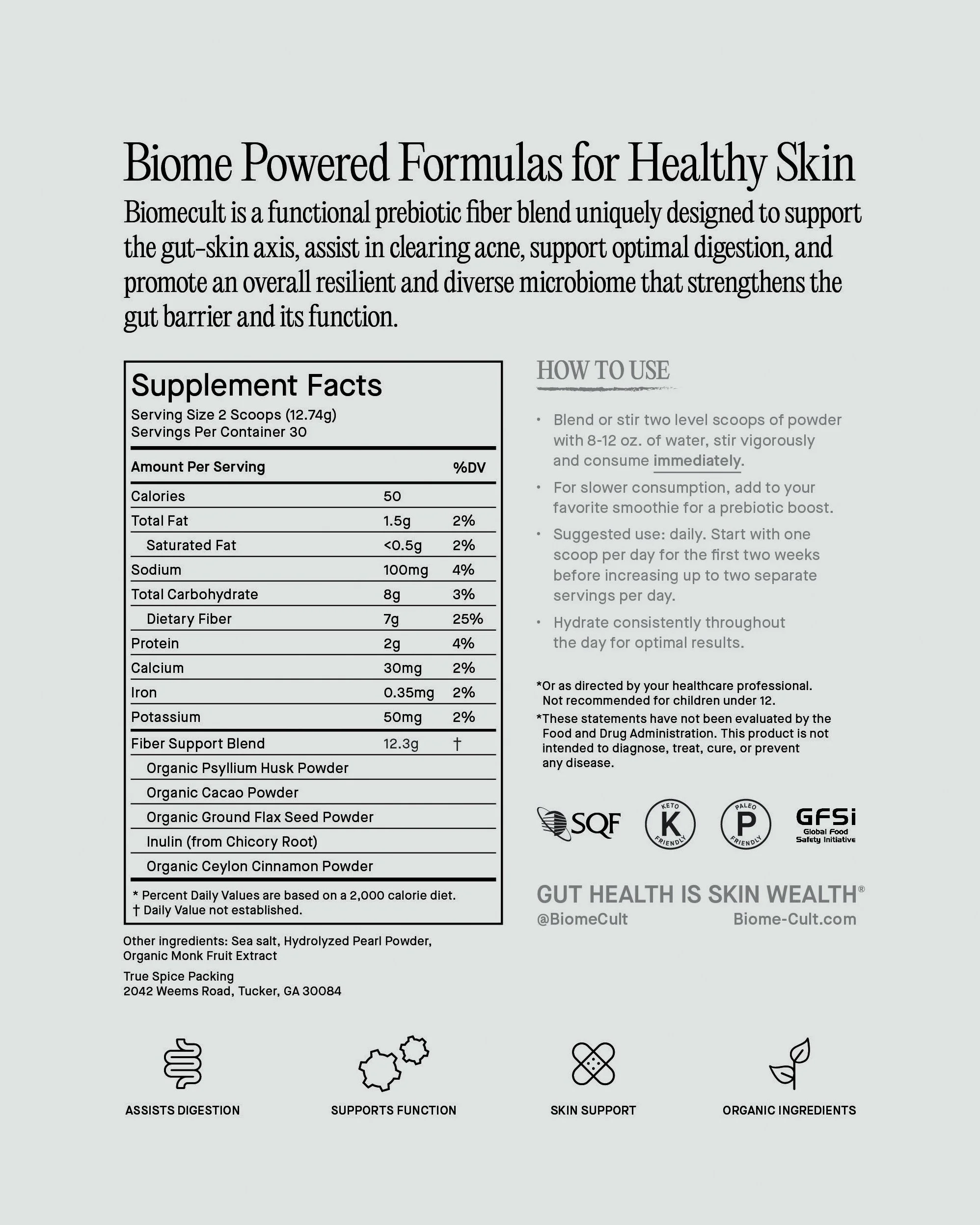 Organic Psyllium Hust Powder, Organic Cacao Powder, Organic Ground Flax Seed Powder, Inulin (from Chicory Root), Organic Ceylon Cinnamon Powder, Sea Salt, Hydrolyzed Pearl Powder, Organic Monk Fruit Extract